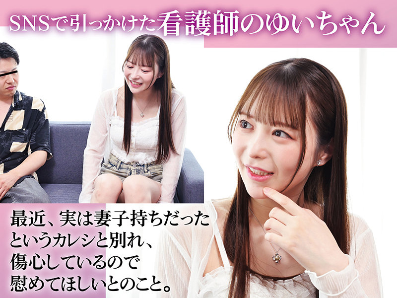 SNSで知り合った看護師・天馬ゆい。既婚者元カレの裏切りでやけになり、慰めを求めて家飲み。愚痴を聞きながらハグ・キスから巨乳愛撫へ移行し、丁寧フェラ・パイズリで応じる。元カレへの当てつけか欲求爆発か、生挿入を自ら求め「中に出して」と懇願。元彼持ちの欲求不満女性のリアルが魅力だが、純粋な癒しや避妊重視派にはミスマッチ。