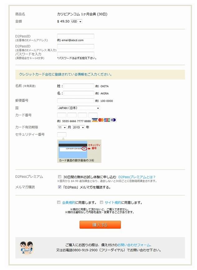 前のぺージで書いたように、郵便番号や名前をここで登録します。D2Passプレミアムやメルマガ購読はご自由にチェックを入れて下さい。ちなみに私はチェックを入れていません。